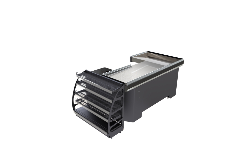 - التصميم: تصميم خطي مستقيم مع وحدة عرض جانبية بأربعة رفوف معدنية، لعرض المنتجات الصغيرة مثل الشوكولاتة والعلكة والمناديل.