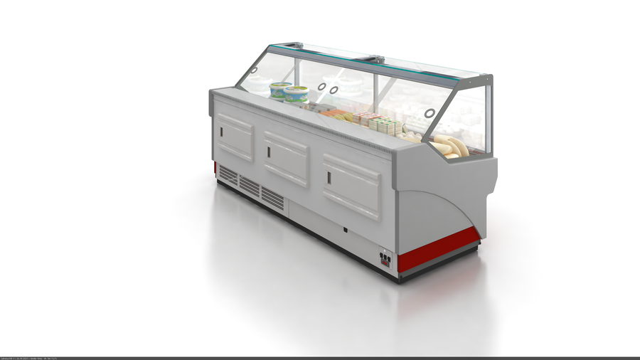 تتميز بتصميم عملي بجوانب رمادية وزجاج أمامي مائل مضاد للتكاثف، مع خلفية مزودة بأبواب تخزين للحفاظ على درجة البرودة للمنتجات الاحتياطية.