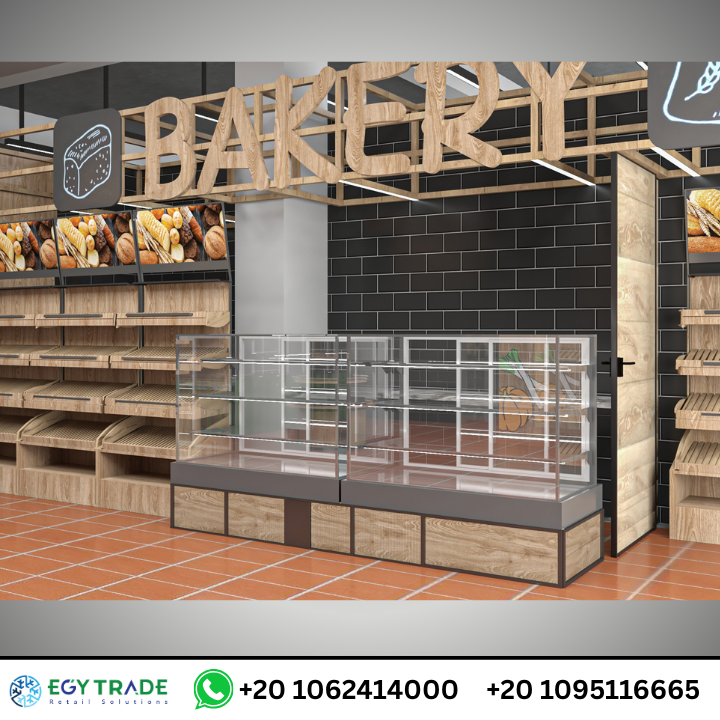 يقدّم هذا التصميم قسم مخبوزات متكامل داخل السوبرماركت، يجمع بين وحدات عرض خشبية أنيقة وخزائن زجاجية أمامية مخصصة للحلويات والمخبوزات الطازجة.