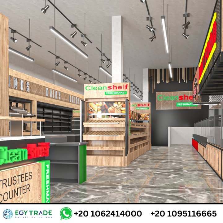تعكس هذه الصورة التصميم المتكامل لمنطقة رئيسية داخل Cleanshelf Fresh Market، حيث تتداخل عدة أقسام بشكل منسق ومحترف: