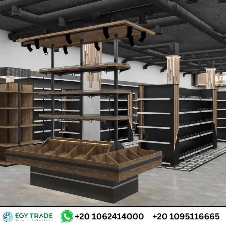 تعرض هذه الصورة وحدة عرض مركزية متطورة داخل السوبرماركت، مصممة بشكل يجمع بين الخشب الداكن والمعدن الأسود لمنح شكل راقٍ ومتناسق مع باقي تصميمات المتجر.