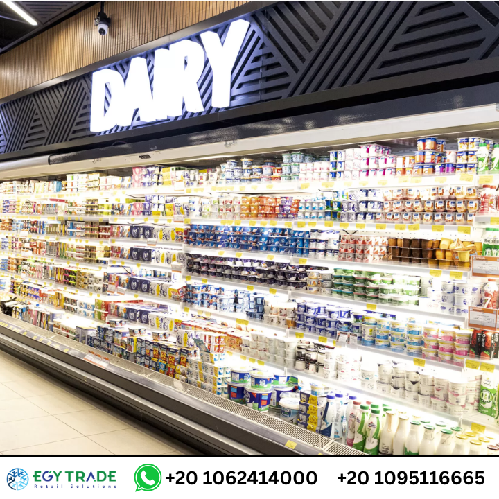 تجهيز قسم الألبان والزبادي داخل السوبرماركت باستخدام ثلاجات عرض مبردة عالية الكفاءة.