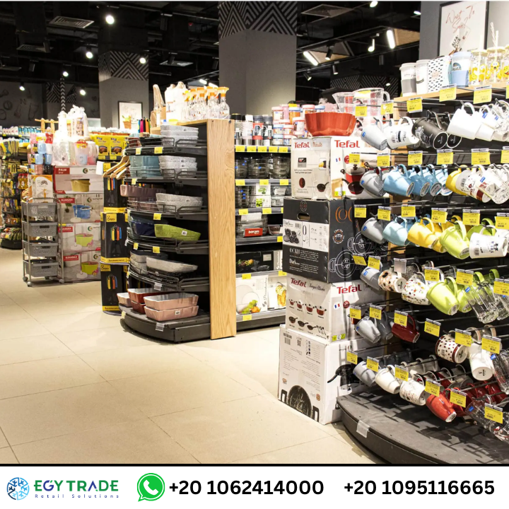 مثالي للهايبرماركت ومتاجر التجزئة لعرض أدوات المطبخ، الأواني، الأكواب، والصناعات المنزلية بشكل منظم وجذاب.