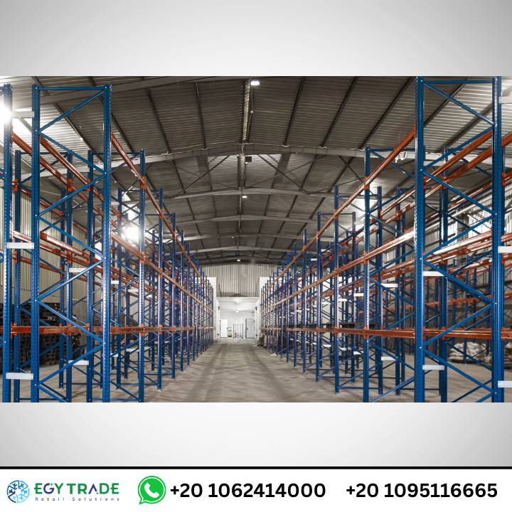 - ممرات واسعة بين الأرفف لسهولة حركة الرافعات والمناولة داخل المخزن.