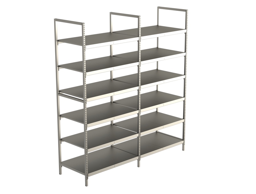 - تصميم مزدوج مكوَّن من عمودين رئيسيين وصفين من الرفوف المتوازية، بإجمالي 10 مستويات عرض.
