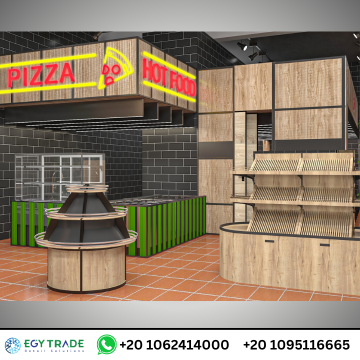 يقدّم هذا التصميم ركنًا متكاملًا للبيتزا والأطعمة الساخنة داخل السوبرماركت، مع وحدة تجهيز أمامية بتشطيب خشبي أسود وجوانب خضراء تمنح المكان طابعًا عصريًا وجذابًا.