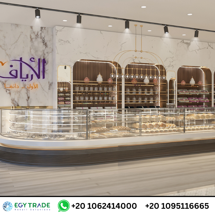 - كاونتر عرض زجاجي بانورامي يعرض المنتجات بوضوح كامل.