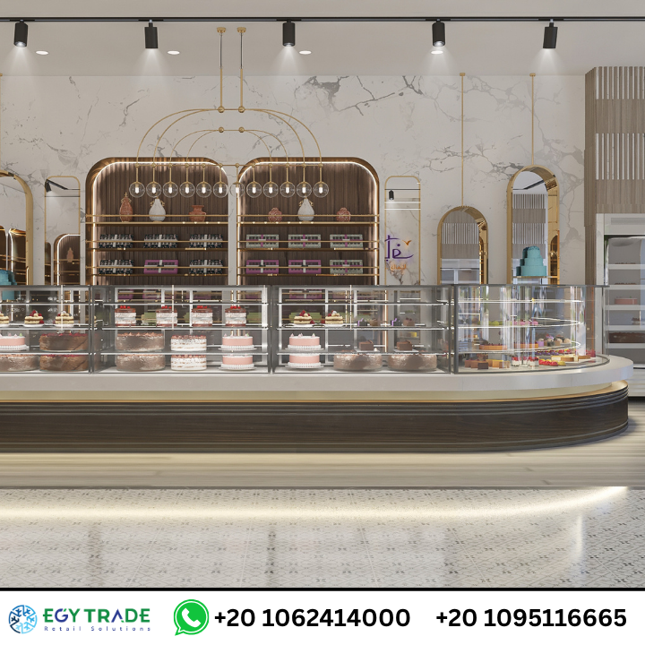 تصميم واجهة عرض راقية مخصّصة للتورت، الجاتوه، والحلويات الفاخرة داخل محلات الباتيسري والكافيهات الراقية.