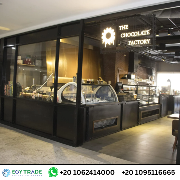 تجهيزات عرض شوكولاتة وجيلاتو مع تصميم كافيه متكامل داخل مول.
