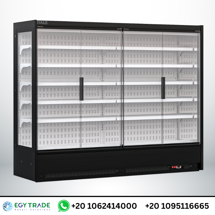 - المميزات: أبواب زجاجية منزلقة لتقليل استهلاك الكهرباء، تصميم أنيق باللون الأسود، مثالية لأقسام الألبان والمشروبات الباردة في السوبرماركت.