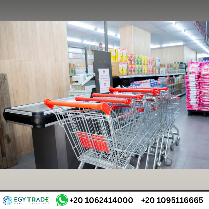 منطقة تجهيز عربات التسوق (Shopping Trolleys Area) أمام كاشير السوبرماركت.