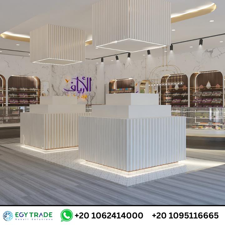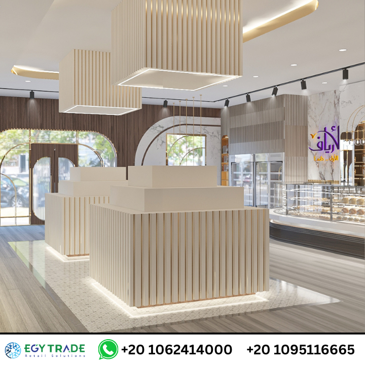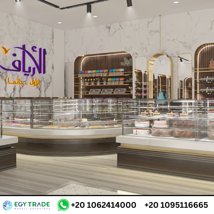 تجهيزات السوبر ماركت لمشروع Aryaf تشمل ثلاجات عرض راقية للحلويات، وحدات مخبوزات حديثة، وتصميمات عرض احترافية، مع حلول تجهيز جاهز للتسليم من إيجي تريد.