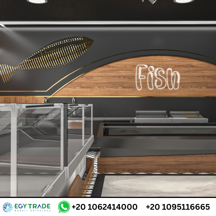 يظهر قسم الأسماك بتصميم متناسق يجمع بين الأسود والخشب الطبيعي، مع لمسات ذهبية تبرز هوية القسم.