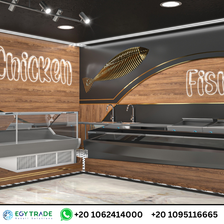 تجهيزات السوبر ماركت لمشروع العقيد مصطفى تشمل ثلاجات عرض متخصصة لأقسام الأسماك والجبن، وحدات بهارات احترافية،