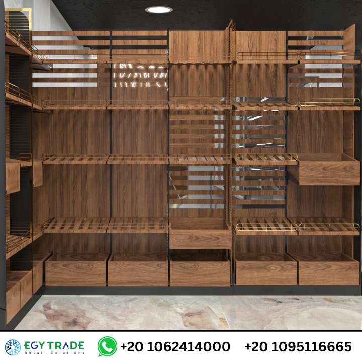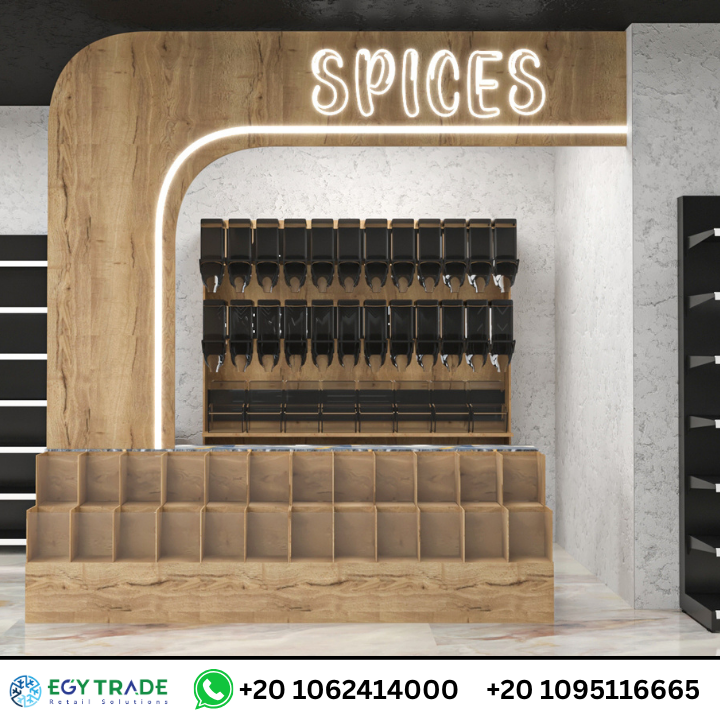 يعتمد التصميم على مزيج بين الخشب والإضاءة البيضاء لإبراز تنوع المنتجات وتسهيل الاختيار.