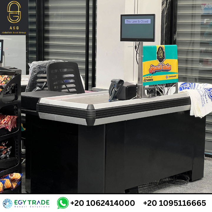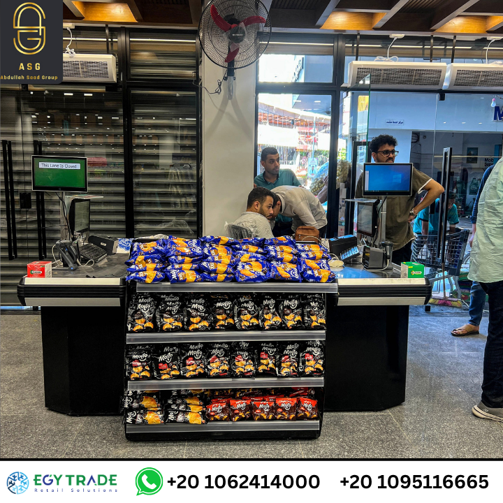 تظهر أيضًا عربات التسوق البلاستيكية والمعدنية المخصصة للفروع ذات الكثافة العالية، مع تجهيز منطقة الكاشير بكونترات دفع عملية ومناسبة لحركة العملاء.
