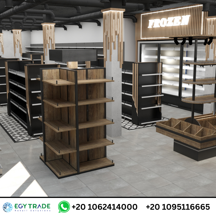 أما وحدات الخضار والفاكهة فتعتمد على تشكيل مزدوج يجمع بين الرفوف الرأسية وعربة عرض أمامية تمنح المتجر طابعًا بصريًا مختلفًا، مع توزيع هندسي يساعد على خلق حركة انسيابية داخل القسم. يعتمد المشروع أيضًا على رفوف معدنية وخشبية متقدمة بألوان داكنة وقوام طبيعي يمنح المكان هوية راقية، بينما توفر الجندولات المركزية حلول تخزين عالية الكفاءة للمواد الغذائية الجافة والعروض اليومية.
