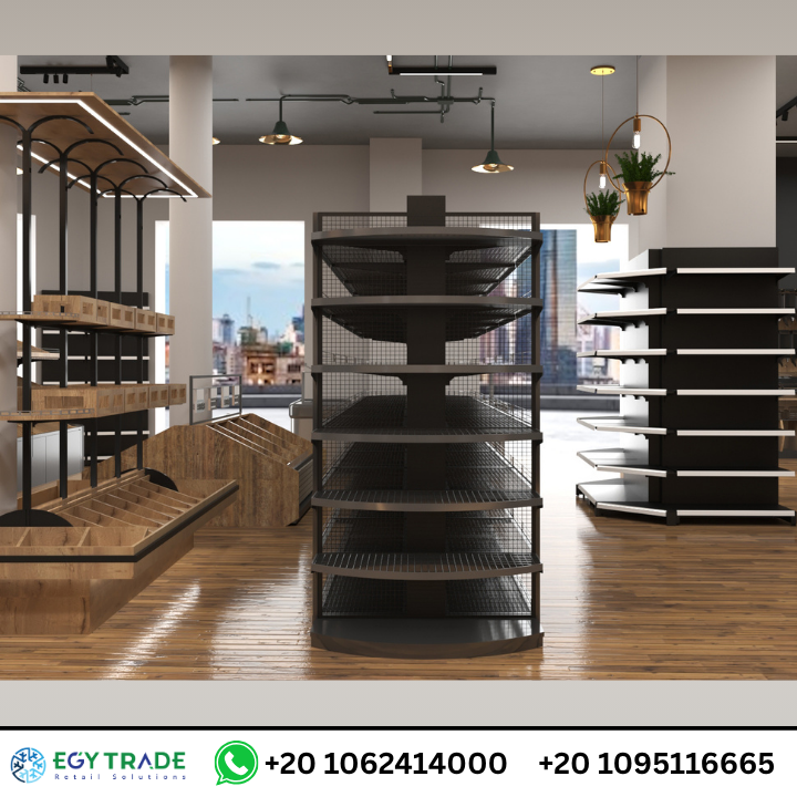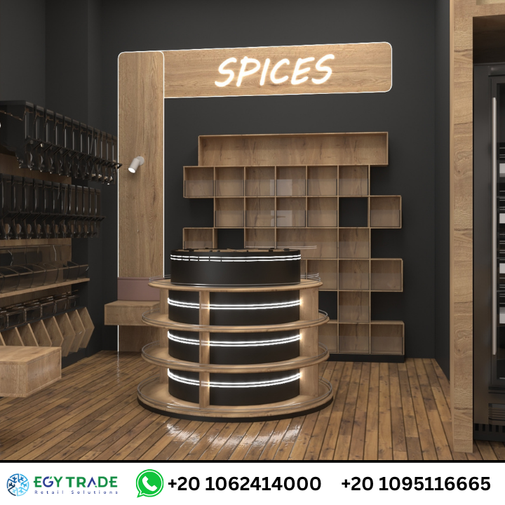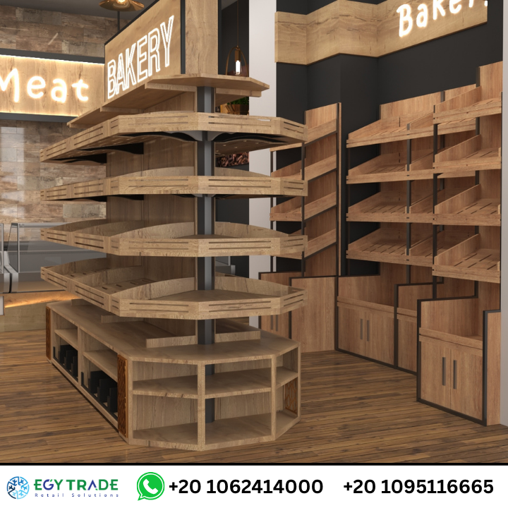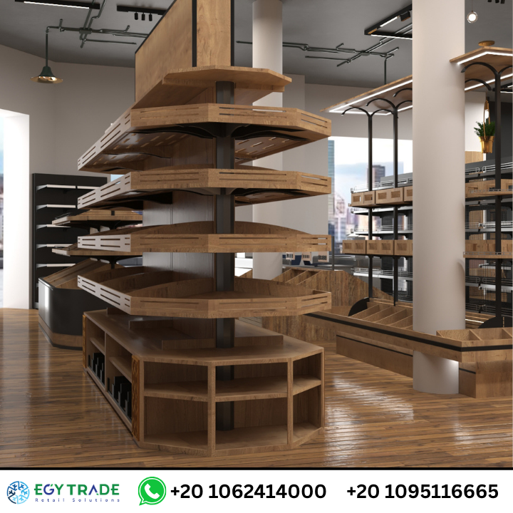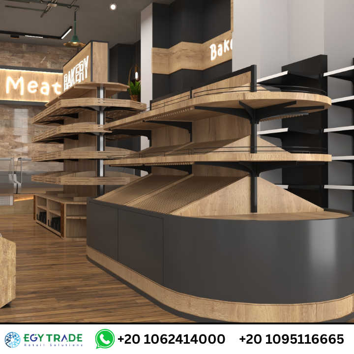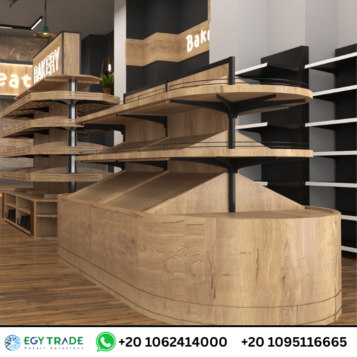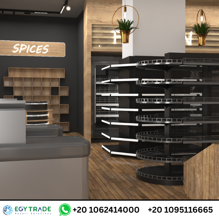 يعرض مشروع HYPER NOUR ELDIN نموذجًا متطورًا لتجهيزات السوبر ماركت من خلال دمج الخشب الطبيعي مع الهياكل المعدنية الحديثة، مما يمنح المتجر طابعًا دافئًا وراقيًا في الوقت ذاته. يعتمد تصميم الجندولات على وحدات خشبية متعددة المستويات، مستندة إلى أعمدة مركزية تسمح بعرض أصناف البقالة الجافة والخضار بطريقة مرنة وجذابة. أما الرفوف المعدنية السوداء فتأتي بخطوط انسيابية وإضاءة علوية، مما يرفع من جودة العرض ويعزز الانتباه للمنتجات.