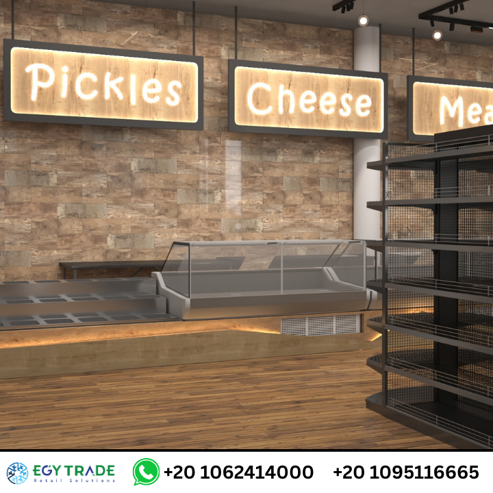 تتوزع ثلاجات العرض الرأسية ضمن جدار عرض كامل مخصص لأقسام المشروبات والمجمدات، مع واجهات زجاجية حديثة توفر رؤية واضحة وتنظيمًا عالي الكفاءة، بينما يتكامل معها خط ثلاجات الديلي بطابع أنيق يعتمد على قاعدة خشبية مضاءة بتقنية LED تمنح القسم جاذبية فورية وتبرز منتجات اللحوم والأجبان والمخللات. ويظهر في المشروع اعتماد واضح على توجيه العميل عبر لافتات مضيئة فوق كل قسم مثل Cheese – Meat – Pickles – Frozen – Drinks – Spices ما يحقق انسيابية واضحة في الحركة الداخلية.