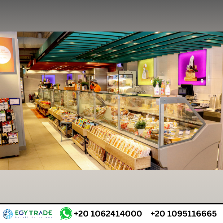 يظهر مشروع مترو بتصميم متكامل يجمع بين وحدات الديلي المتقدمة وثلاجات العرض الأفقية المزودة بزجاج أمامي عالي الوضوح، مما يسمح بتقديم الجبن، اللحوم الباردة، والمخبوزات بأسلوب احترافي يحافظ على جودة المنتجات. تمت إضافة وحدات تخزين أمامية خشبية أسفل الثلاجات لزيادة عرض السلع خفيفة الحركة وتعزيز المبيعات في منطقة الخدمة المباشرة.