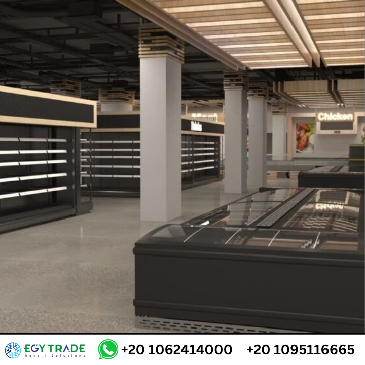 تحليل مشروع EGY DESIGN لتجهيزات السوبر ماركت، مع عرض الثلاجات الرأسية، وحدات الخضار والفاكهة، والرفوف المعدنية بتصميم احترافي جاهز للتسليم.