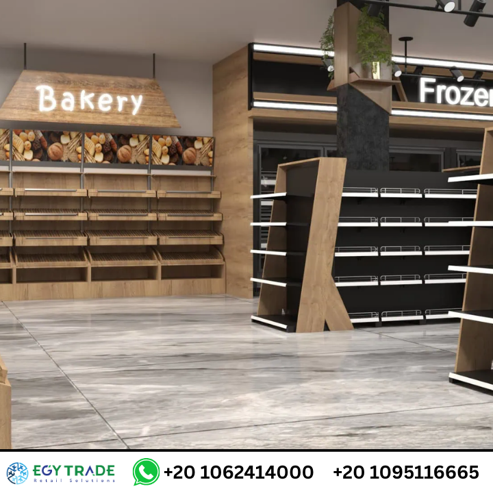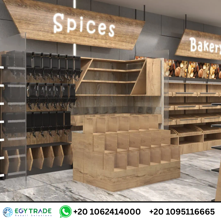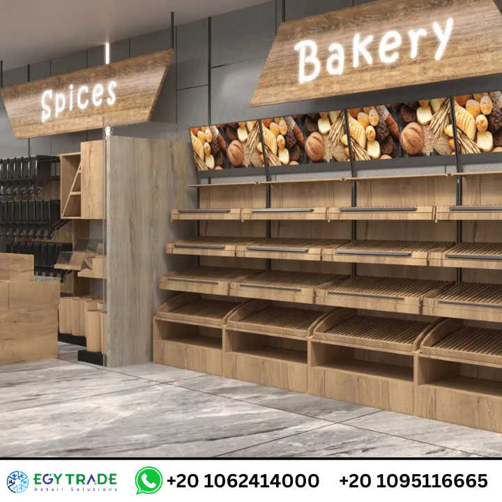 قسم المخبوزات في مشروع EGY DESIGN يعتمد على تشطيب خشبي كامل مع رفوف عميقة متعددة المقاسات.