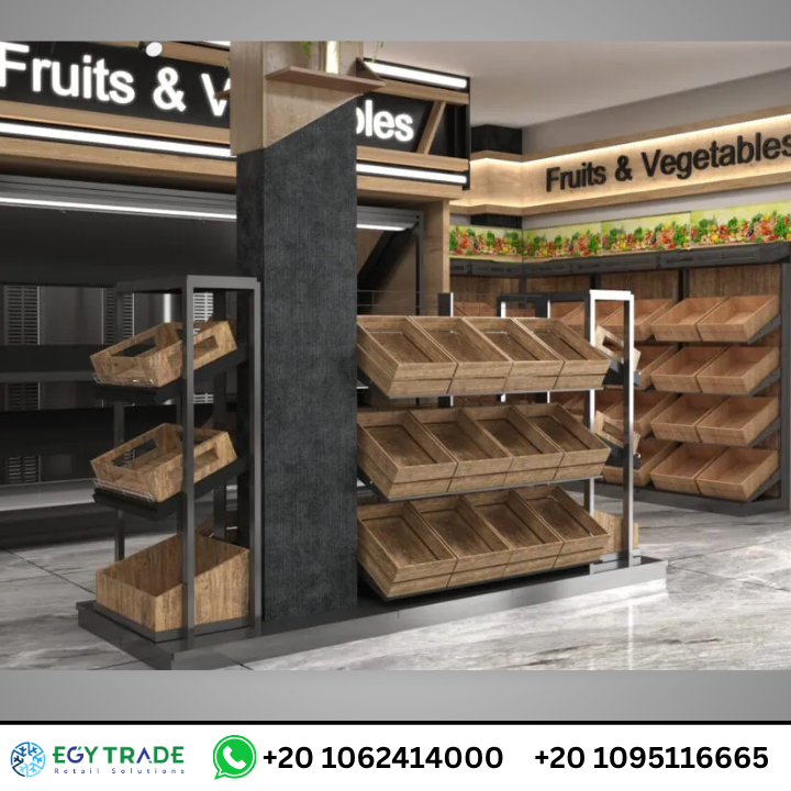 يتميز المشروع بوحدات عرض خشبية متعددة المستويات داخل قسم الخضار والفاكهة، مع توزيع يوازن بين الجدار الرئيسي والجندولات الوسطية.