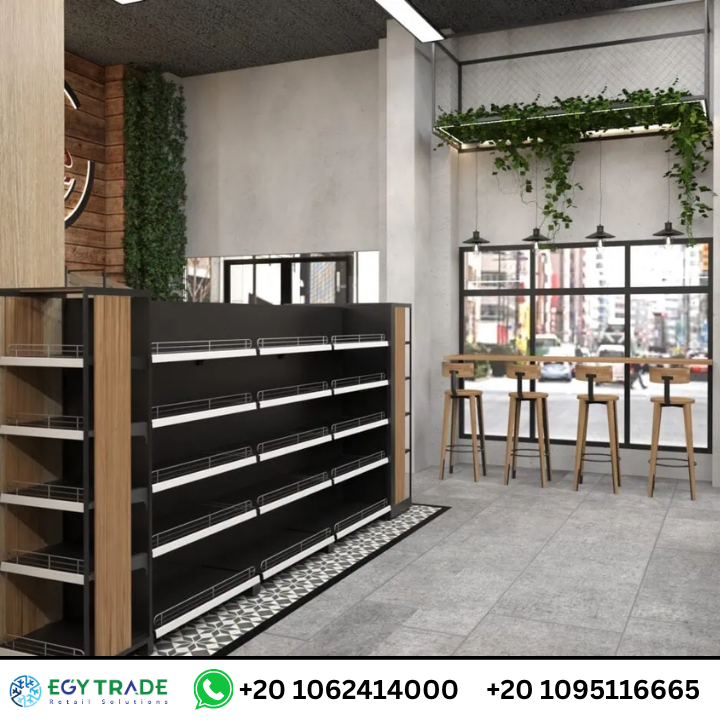 المشروع يستخدم جندولات معدنية ذات إطار أسود وألواح خشبية، وهو مزيج يمنح المتجر مظهرًا راقيًا وعصريًا.