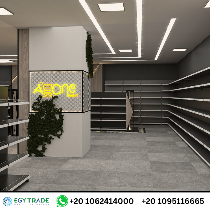 المنطقة تعتمد على وحدات عرض معدنية عريضة ذات مستويات متعددة، مما يسمح بتوزيع المنتجات بطريقة مرئية وواضحة.