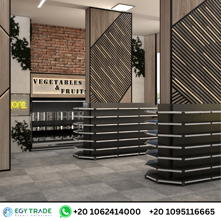 الصور تُظهر ممرًا مخصصًا للخضار والفاكهة بواجهة خلفية تحمل نفس الطابع الخشبي الهندسي المستخدم في التصميم العام.