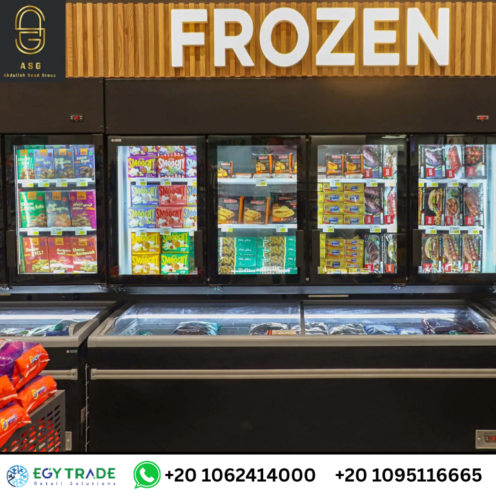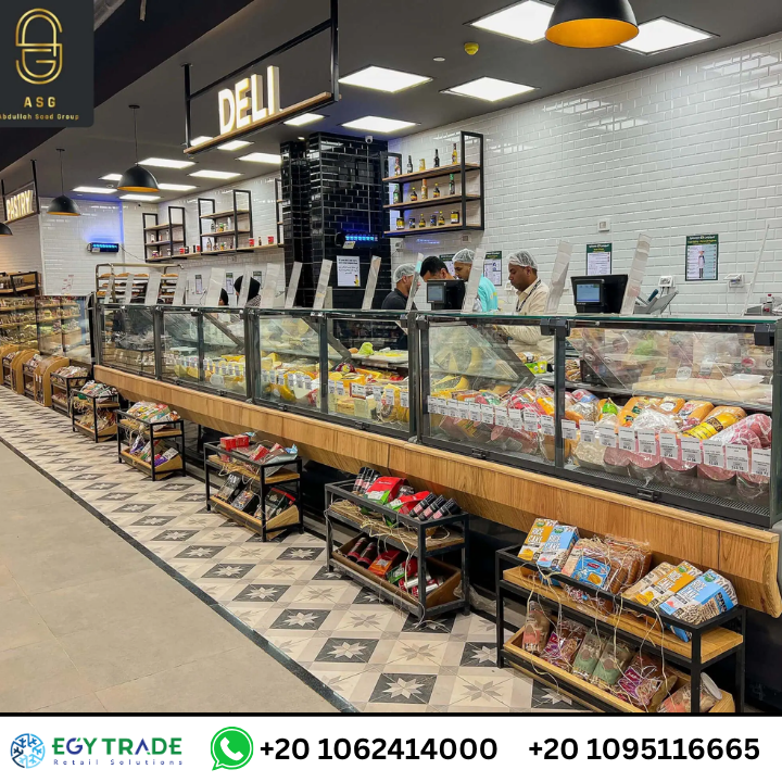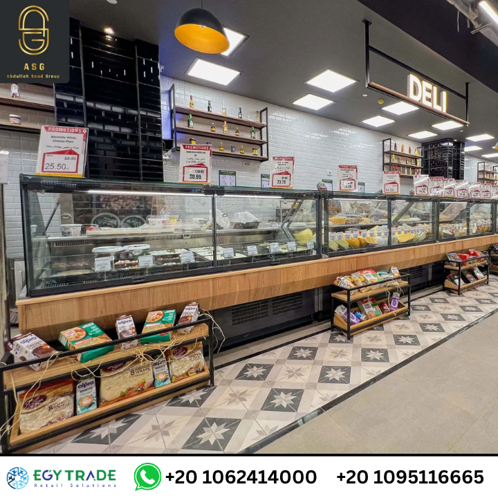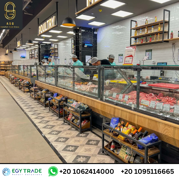 المنطقة مميزة بخط طويل من ثلاجات عرض أمامية ذات واجهات زجاجية مستقيمة، مناسبة لعرض اللحوم الباردة، الأجبان، والمخبوزات الجاهزة.