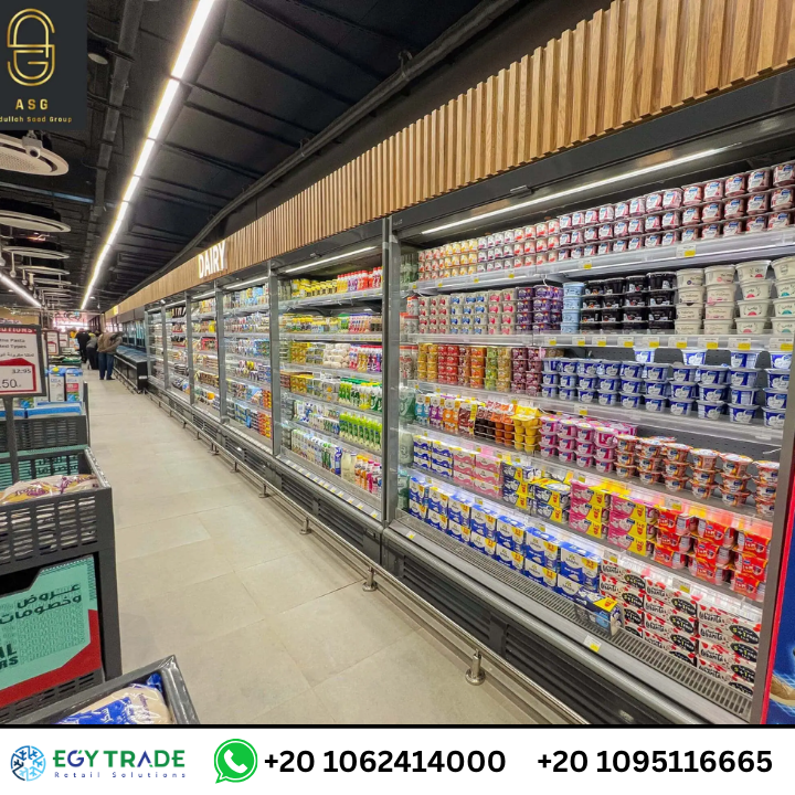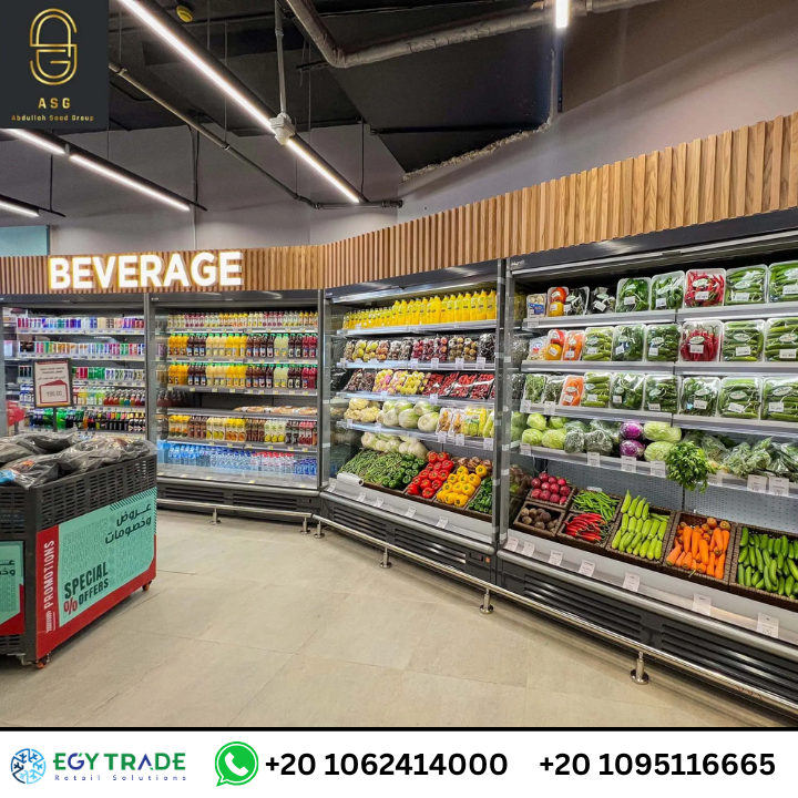 الصور تُظهر اعتمادًا كاملاً على تجهيزات السوبر ماركت الاحترافية من ثلاجات رأسية، وحدات ديلِي طويلة، وجندولات مصممة لدعم عرض المنتجات بكفاءة عالية.